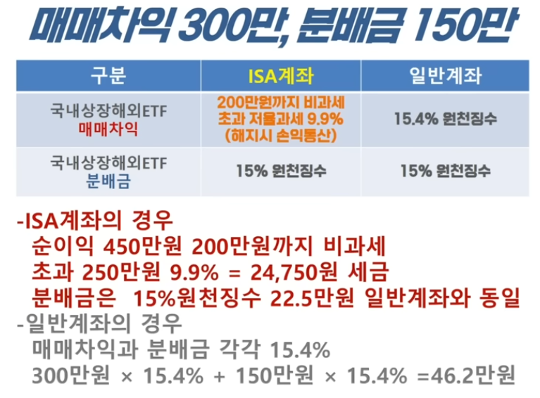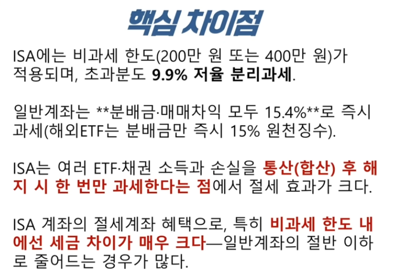 A2. 매매 차익은 둘 다 비과세이나, 분배금(배당금)은 ISA에서 비과세/저율 과세 혜택을 받을 수 있어 ISA가 월등히 유리합니다.