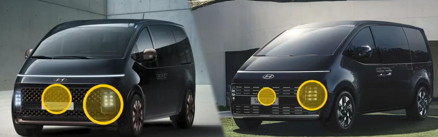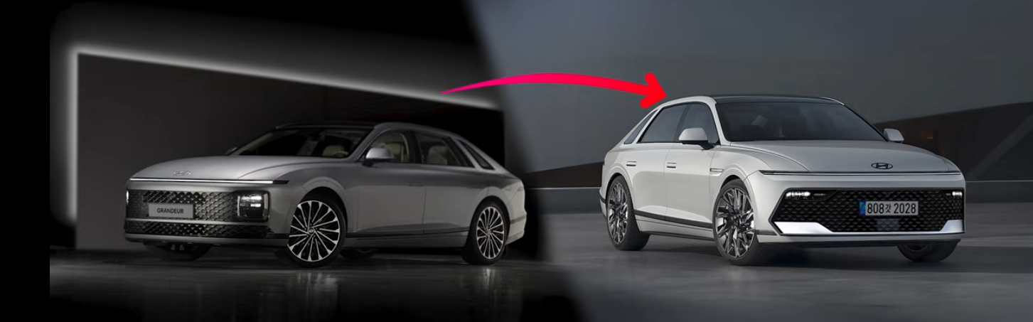 - 그랜저 페이스리프트: 디자인이 한층 더 잘 다듬어졌습니다. 특히 전면 헤드램프는 가로형으로 바뀌어 스타리아를 닮았다는 논란을 해소하고, 후면 방향지시등은 범퍼 하단에서 시인성이 좋은 상단으로 이동했습니다. 실내는 기존의 긴 디스플레이가 16:9 PlayOS로 통일되어 더욱 깔끔하고 사용이 편리해집니다.